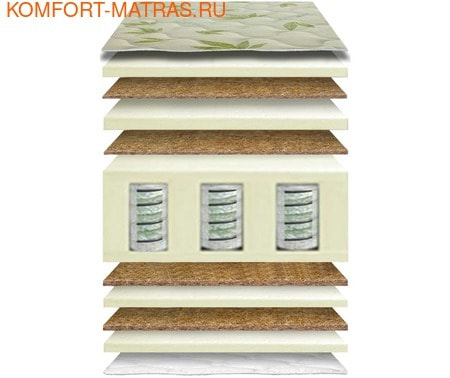 СОСТАВ: "Дуэт" размещен в моноблоке из ППУ, Латекс натуральный - 2см, Кокос -1см, Билаксиласт - 2см, Кокос -1 см, Хлопковая ткань на глубокой рельефной стёжке. H=27 см.